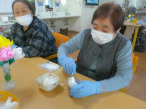 おやつレクを始める前に、しっかりと手洗い、手指消毒、さらにビニール手袋をして、準備万端!