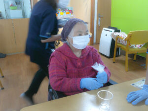 おやつレクを始める前に、しっかりと手洗い、手指消毒、さらにビニール手袋をして、準備万端!