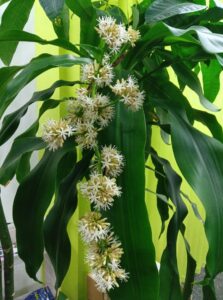 ドラセナは「幸福の木」として知られる人気の観葉植物で、5年から10年に一度花を咲かせるらしいです。品種別に花言葉がありますが、全般としては「幸運」という縁起の良い花言葉をもっているとのことです。