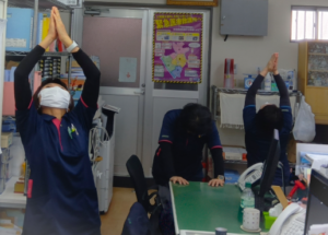 午前・午後に1回ずつ「リフレッシュタイム」を設け、全員で体を動かしています。