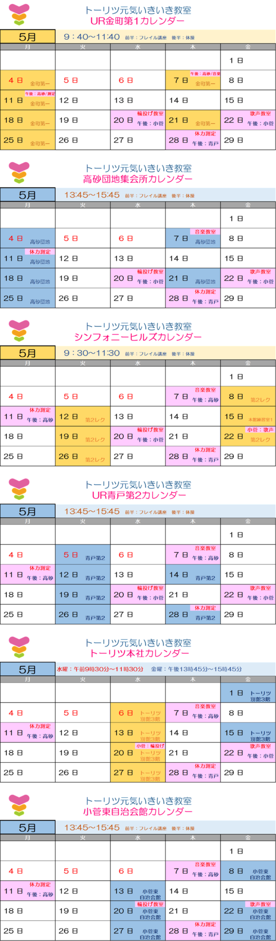 さて、5月のカレンダーをお知らせ致します。4月から始まった輪投げ教室・体力測定会場追加や変更を早く定着させてたくさんの方に参加して頂きたいと思っております。